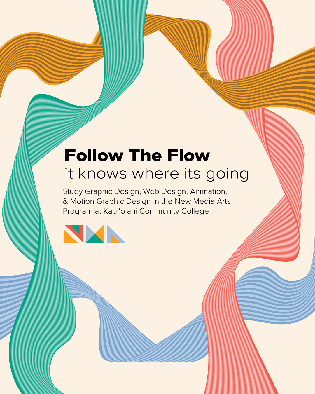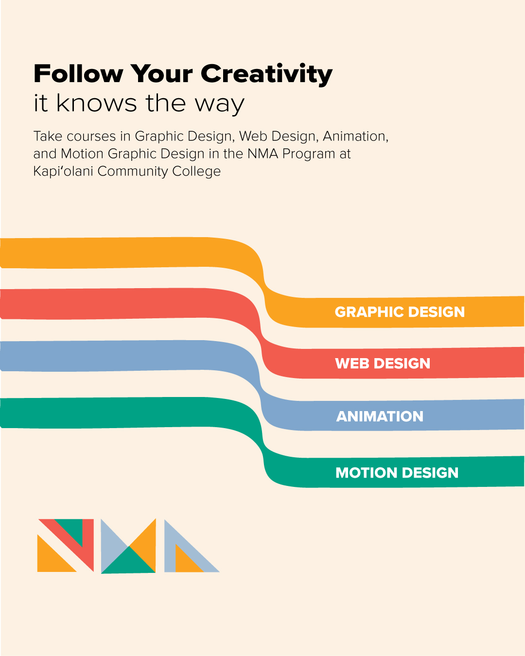I developed the Pathways Campaign, an Instagram series highlighting the four New Media Arts tracks: Graphic Design, Web Design, Animation, and Motion Design. Each pathway was assigned a distinct color and represented through flowing visual lines to symbolize growth and direction. The system allowed prospective students to quickly identify their area of interest while presenting the program as structured, dynamic, and future-focused.