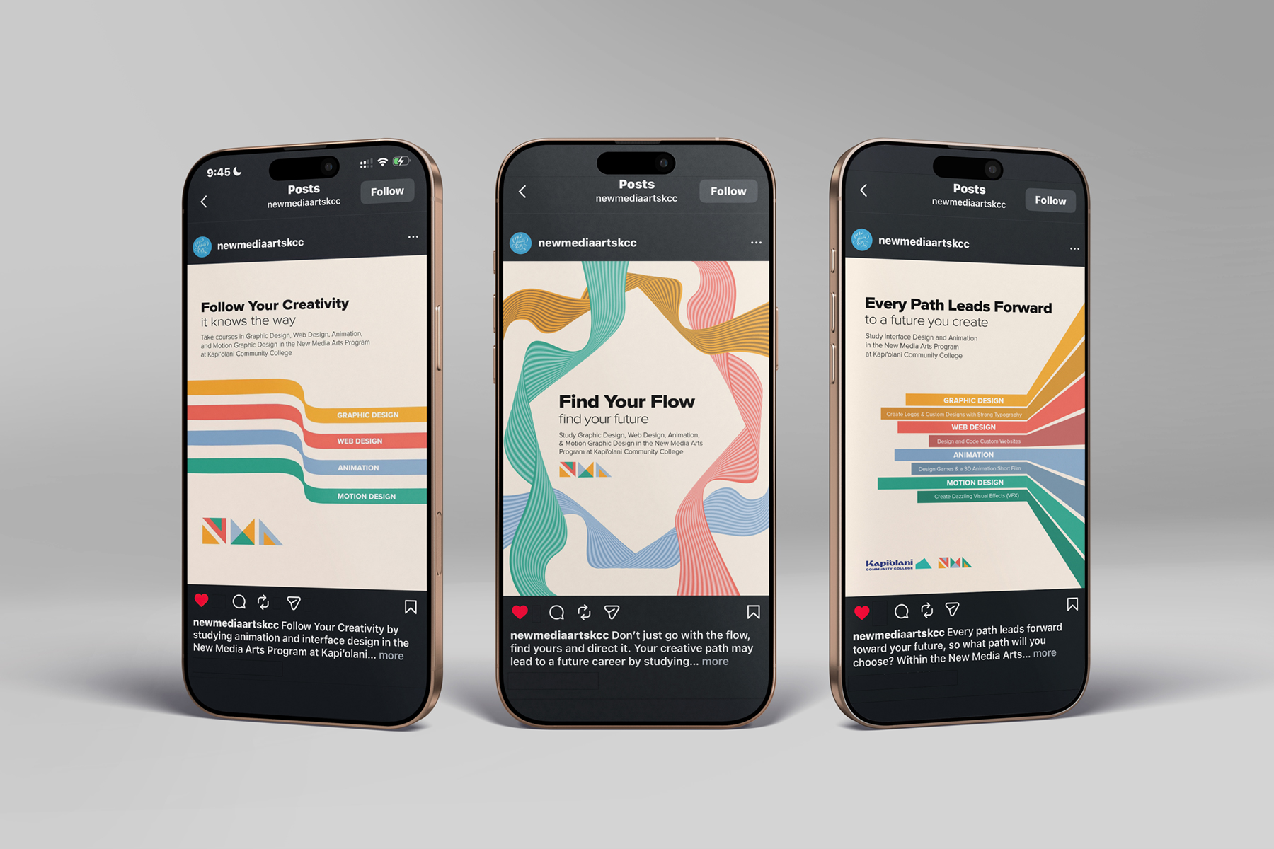 During enrollment season, the New Media Arts program at Kapiʻolani Community College needed clear and engaging visuals to help prospective students understand their academic options. The challenge was to communicate multiple program pathways in a way that felt cohesive, accessible, and visually compelling on Instagram.